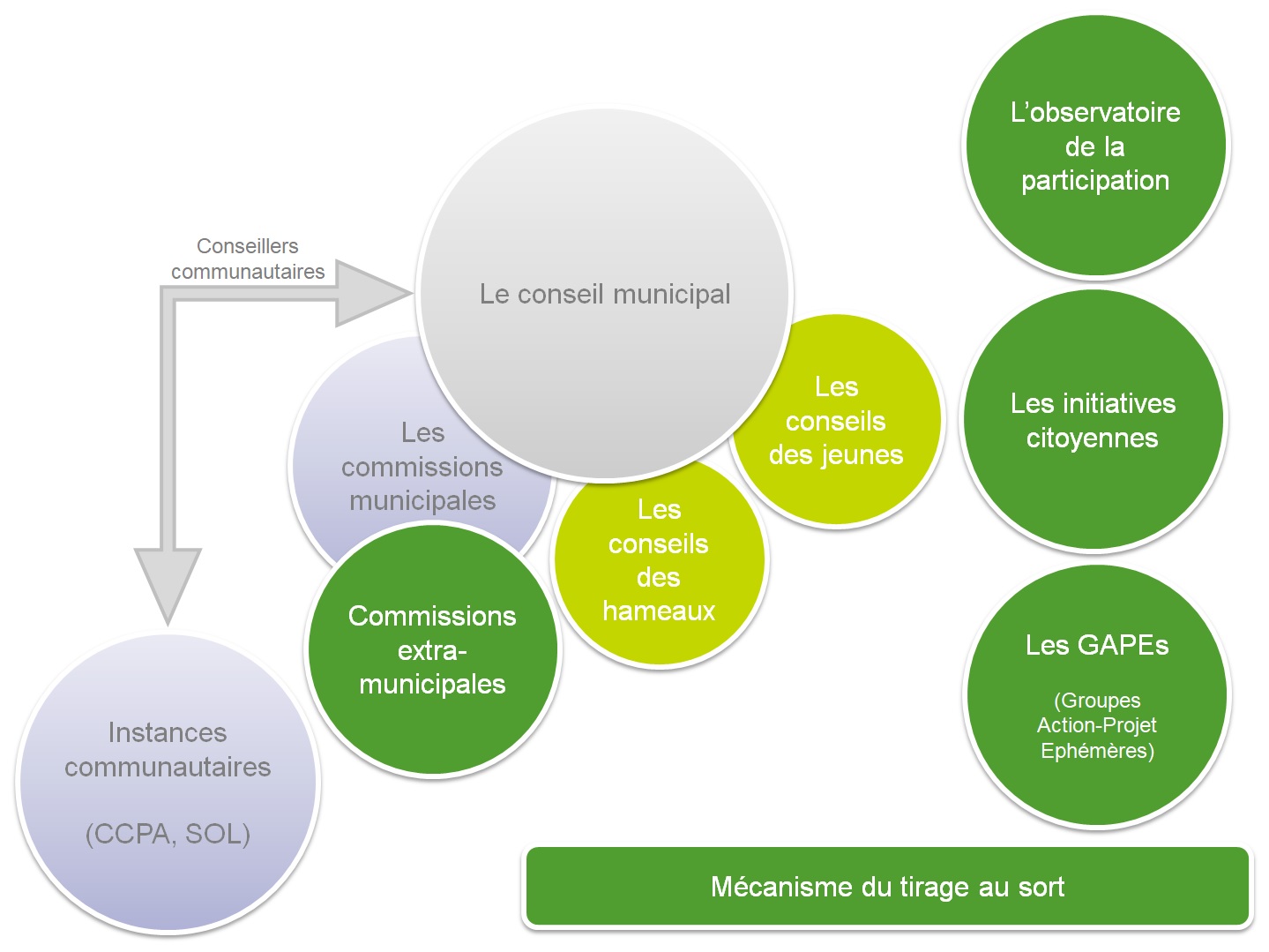 Structure légale du fonctionnement d’une municipalité avec un/une maire élu(e) par les conseillers municipaux se réunissant régulièrement et dont les réunions sont ouvertes au public avec possibilité d’intervention en fin de conseil quand celui-ci est clos.
